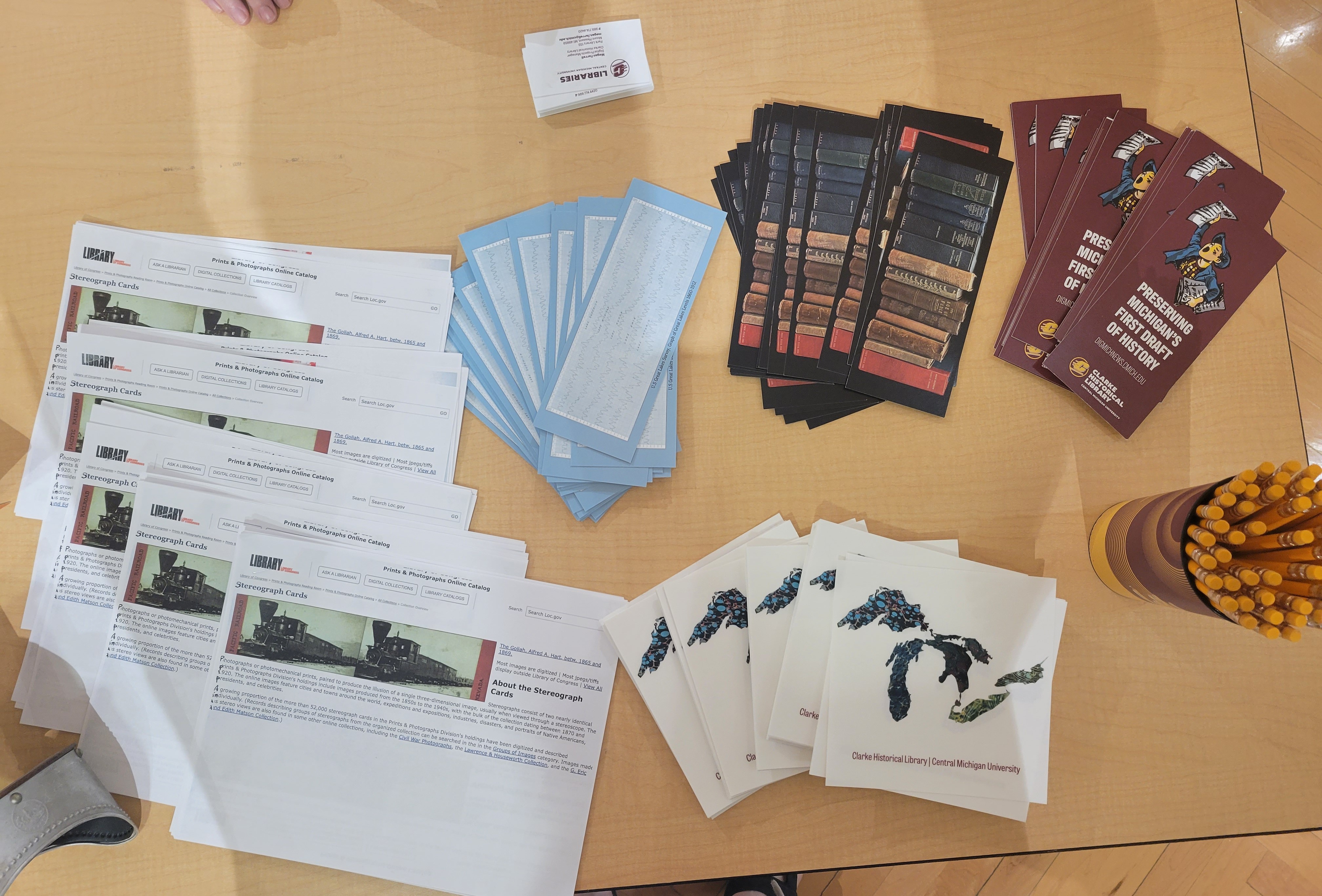 Yesterday was Grandparents U at CMU. Grandparents and children stay at CMU and engage in multiple fun activities. This year's theme was elephants based on the book and Netflix movie the Magician's Elephant. I highly recommend it. The CMU Libraries had a lot of fun activities to offer. In the Clarke we shared circus posters featuring elephants, a stereograph of the Forepaugh circus parade (with multiple elephants) in Kalamazoo (above), and other stereographs depicting the lives of children in the late 19th century. Everyone's favorite was the relatable hair brushing (Pulling and hurting) stereograph. The bare butt bath also made everyone smile. It was interesting to hear that most of the grandparents had parents or grandparents with stereograph collections that they had enjoyed as children. We also had handouts and treats. One of the handouts was how to download stereographic images from the Library of Congress and make your own working and easy to make 3-d viewer (see https://www.loc.gov/pictures/collection/stereo/) One boy was sick and sad he couldn't come, and several were homeschooled and needed activities, so their grandparents were thrilled about the handouts. Our guests also had to find an elephant image (Dumbo) hidden in the exhibit cases, which made them explore our exhibit. Here are some pics before guest arrived. Other parts of the libraries had a fortune telling tent (part of the Magician's Elephant storyline), a make a librarian laugh joke book area, using your phone you could watch an elephant walking through the 3rd floor stacks, and they concluded by making a cute 3-d elephant card with a crinkled trunk. What a great excuse to wear my elephant jewelry and share some Michigan circus history!